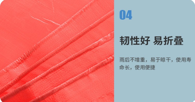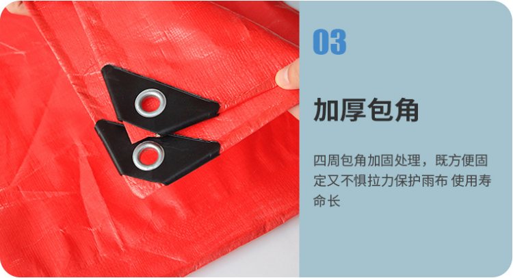 大紅色PE防水篷布加厚包角:四周包角加固處理,既方便固定又不懼拉力保護雨布,使用壽命長。