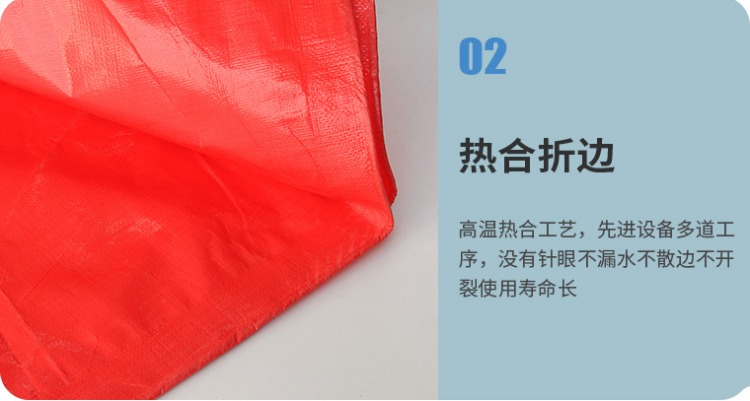 大紅色PE防水篷布熱合折邊:高溫熱合工藝,先進設備多道工序,沒有針眼不漏水、不散邊、不開裂,使用壽命長。